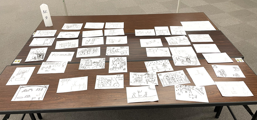 前回の振り返り、まちでのとりくみの先行事例のおはなしをした後、2回目に描いていただいたものがこちら!よりたくさんの人やいろんな場所での活動を描いていただけるようになりました。